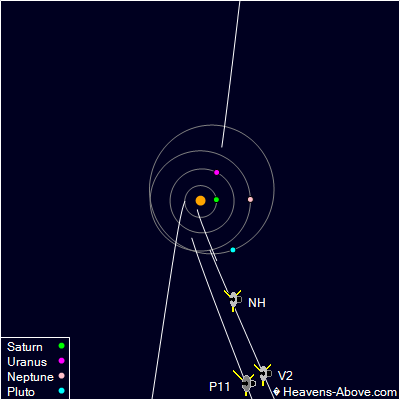 | Pioneer 10 | Pioneer 11 | Voyager 2 | Voyager 1 | New Horizons | | Distance from Sun (AU) | 140.565 | 118.054 | 142.235 | 169.947 | 64.071 | | Speed relative to Sun (km/s) | 11.869 | 11.131 | 15.261 | 16.921 | 13.591 | | Speed relative to Sun (AU/year) | 2.504 | 2.348 | 3.219 | 3.570 | 2.867 | | Ecliptic latitude | 3° | 14° | -38° | 35° | 2° | | Declination | 25° 57' | -8° 55' | -59° 24' | 12° 12' | -20° 7' | | Right ascension | 5h 11m | 18h 57m | 20h 10m | 17h 18m | 19h 21m | | Constellation | Taurus | Scutum | Pavo | Ophiuchus | Sagittarius | | Distance from Earth (AU) | 140.511 | 118.508 | 142.670 | 169.960 | 64.604 | | One-way light time (hours) | 19.48 | 16.43 | 19.78 | 23.56 | 8.95 | | Brightness of Sun from spacecraft (Magnitude) | -16.0 | -16.3 | -15.9 | -15.5 | -17.7 | | Spacecraft still functioning? | no | no | yes | yes | yes | | Launch date | 1972-Mar-03 | 1973-Apr-06 | 1977-Aug-20 | 1977-Sep-05 | 2006-Jan-19 |